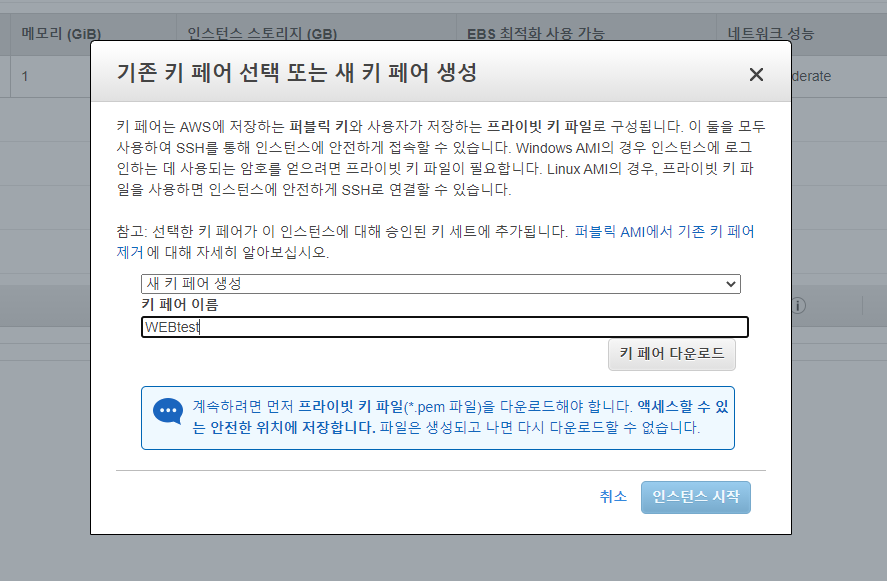 저희는 키가 없으니 새 키 페어 생성을 선택 후 이름을 입력 후 다운로드를 눌러줍니다.