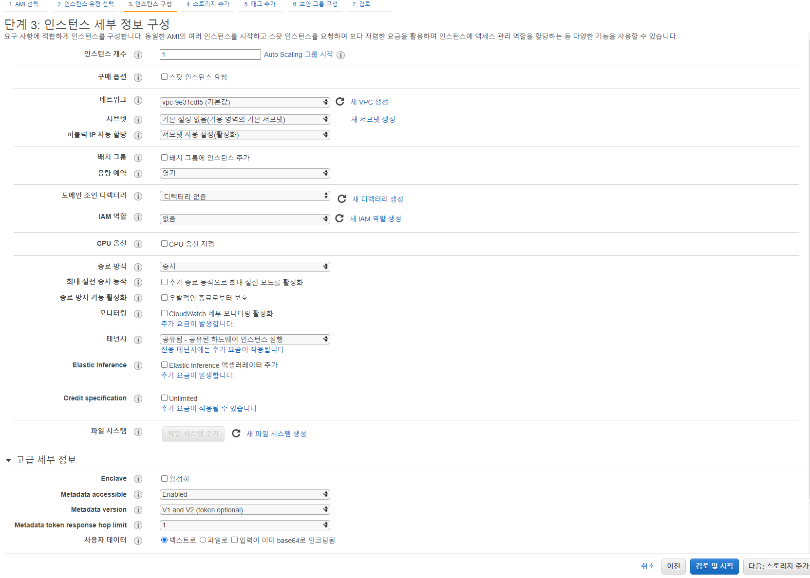 이제 인스턴스 세부 구성인데 저희는 생성이 목적이기 때문에 별도의 설정을 하지 않고 넘어가겠습니다.