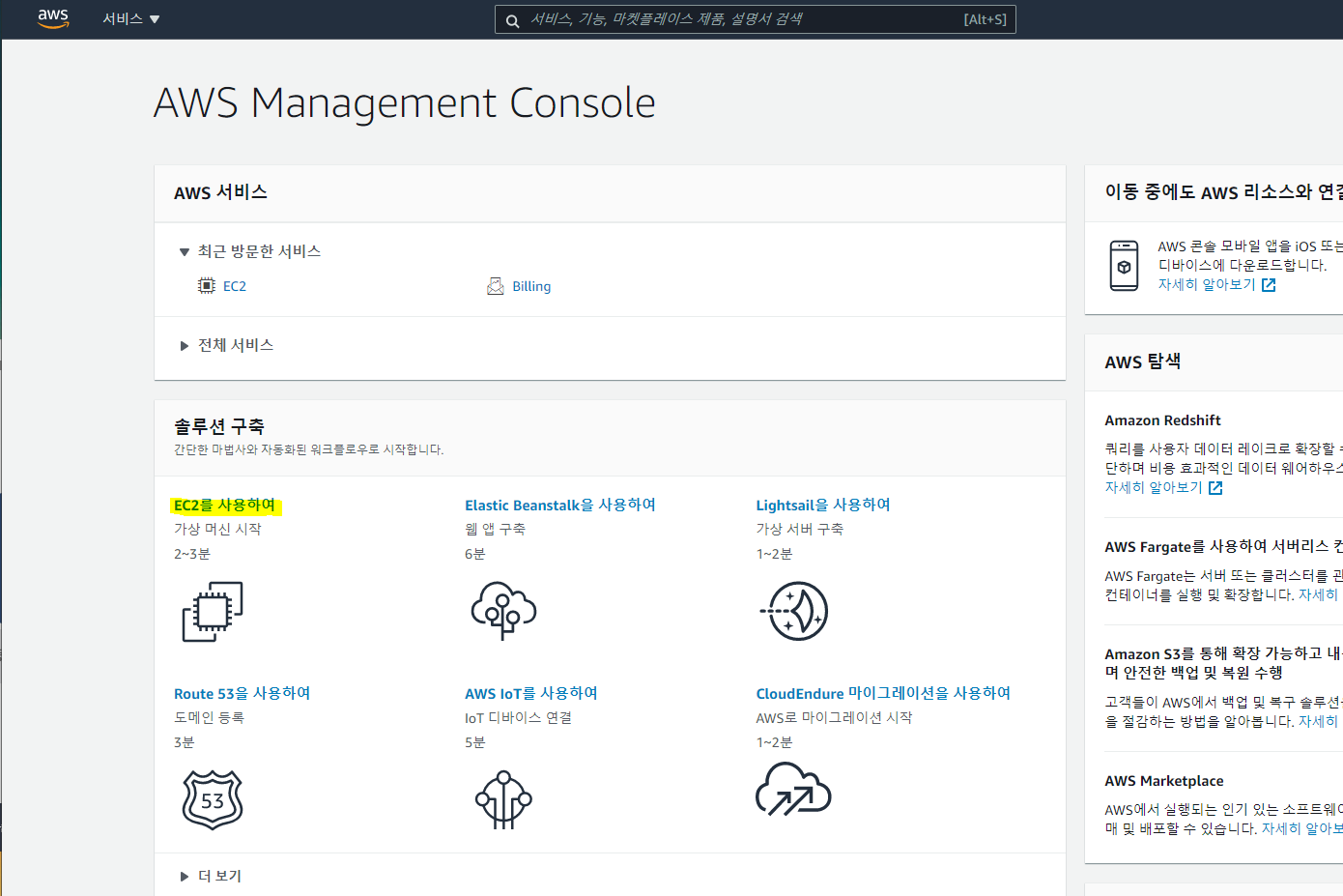 그럼 메인 페이지에서 'EC2를 사용하여' 를 클릭해줍니다.