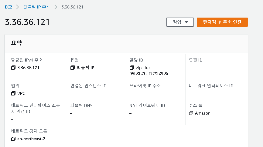 그리고 오른쪽 상단에 탄력적 IP 주소 할당을 눌러줍니다.