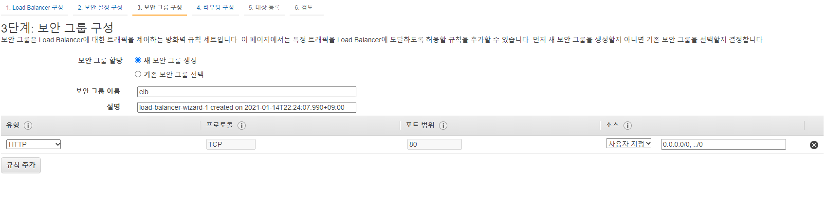 보안 그룹이 있지만 저는 ELB로 새로 한 개 만들어주겠습니다.
