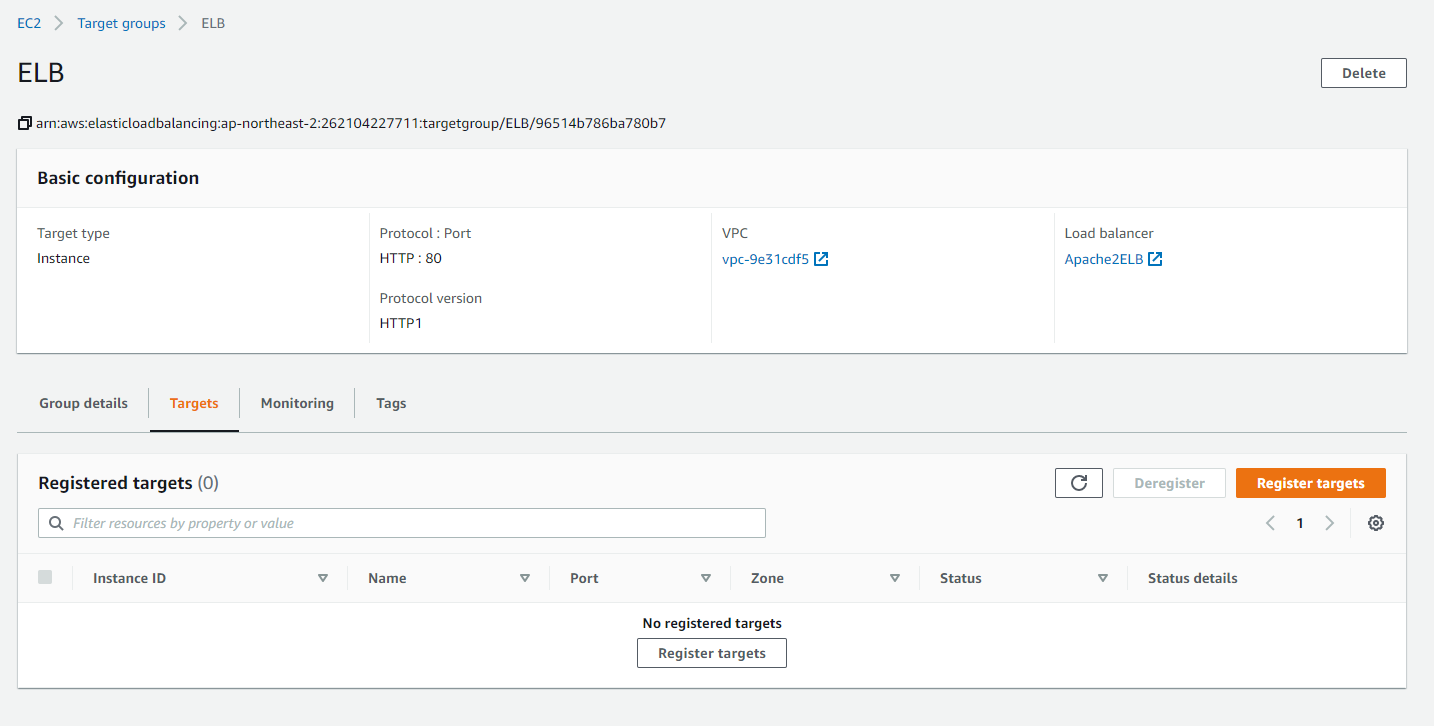이제 인스턴스를 등록해줘야합니다. Register targets을 눌러줍니다.