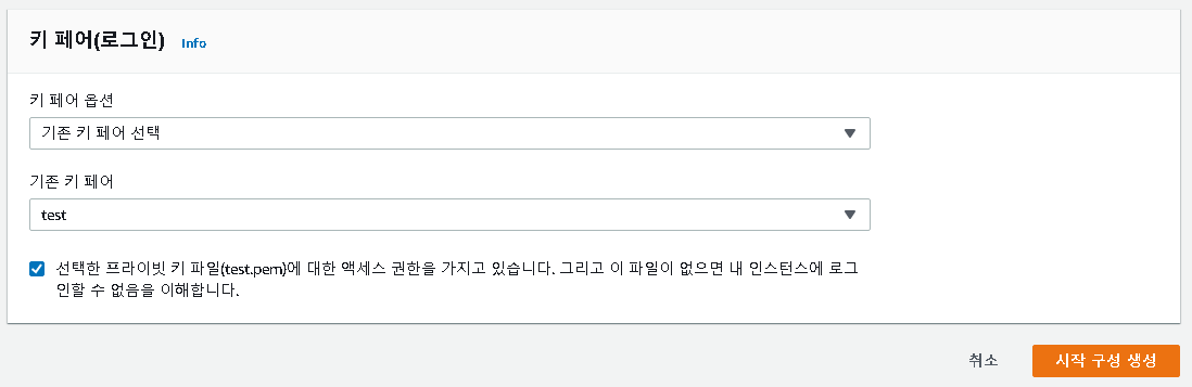 이제 키 페어 설정입니다. 저는 기존에 사용 중인 키 페어를 이용해서 로그인하겠습니다.