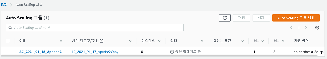 검토 창을 지나고 생성을 하면 이렇게 Auto Scaling 그룹에 생성된 것을 볼 수 있습니다.