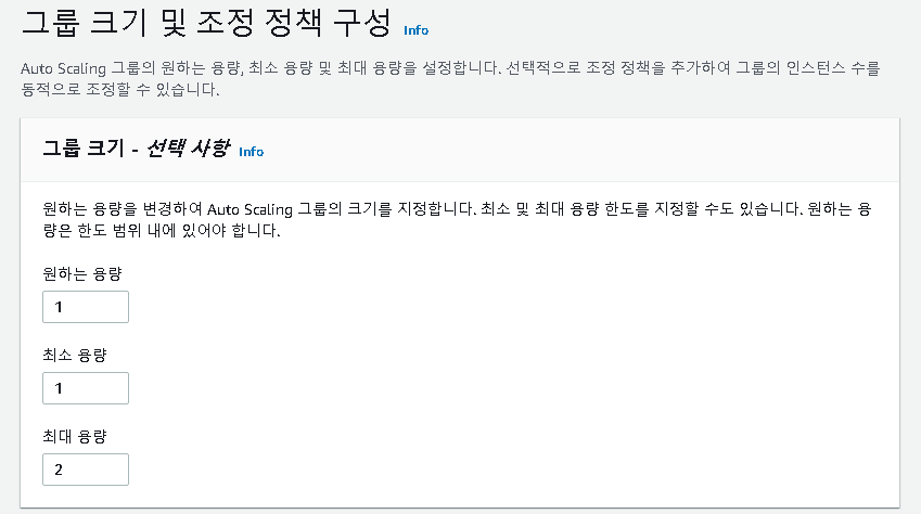 이제 그룹 크기를 지정하는 곳이 나옵니다. 최대 & 최소 인스턴스를 몇 개로 할지 지정하면 됩니다.