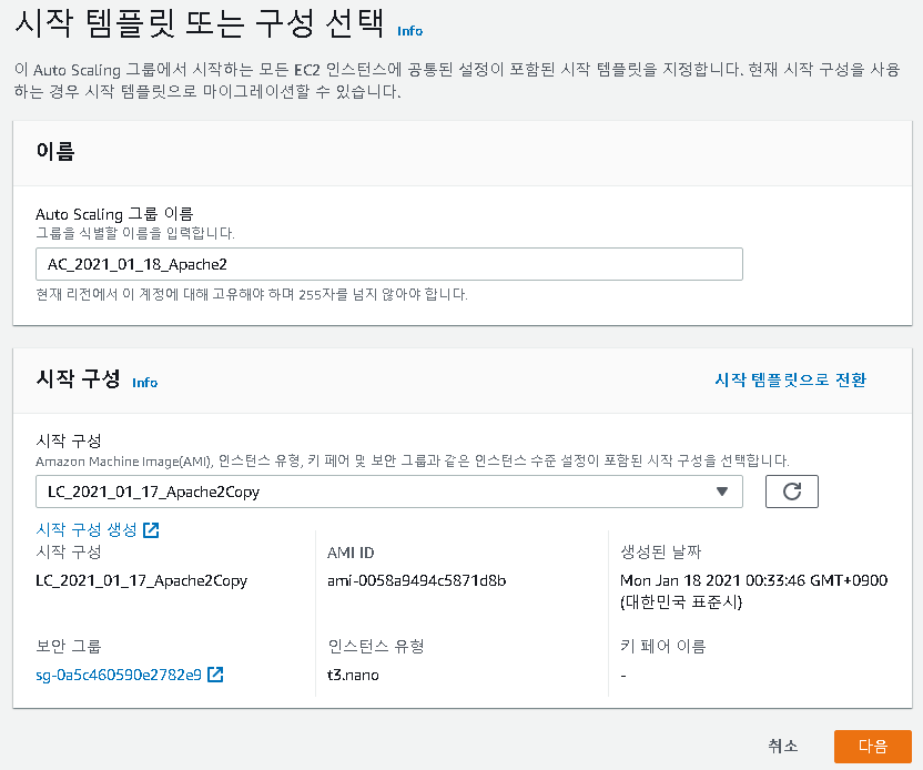 그럼 이렇게 시작 구성에 자동으로 만든 구성이 입력되고 그룹 이름을 입력하고 넘어가주세요.