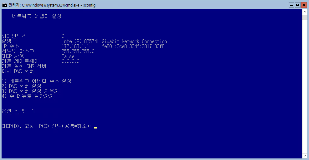 이제 네트워크 주소를 변경하기 위해서 1번을 선택 후 엔터를 눌러주세요.