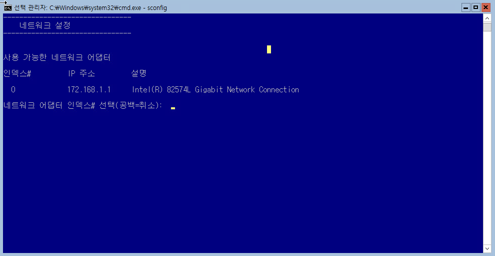 여기서 변경할 네트워크 어댑터의 인텍스를 숫자로 입력하시고 엔터를 눌러주세요.( 저의 경우 0 )