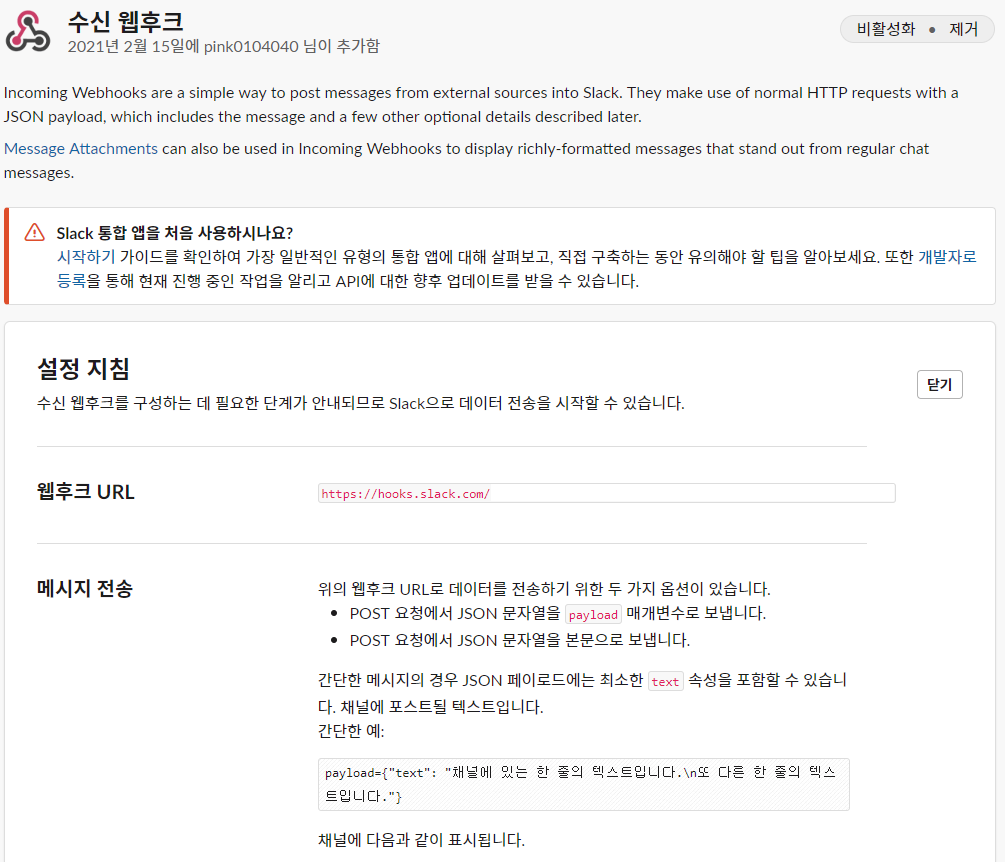 그럼 저렇게 웹후크 URL이 나오는데 메모해주시면 되겠습니다.