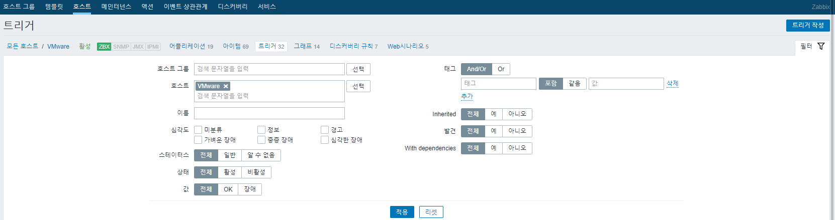 저는 VMware 호스트에서 트리거를 만들겠습니다. 각자 만든 호스트에서 진행하시면 됩니다.