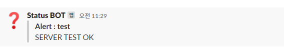 | [root@zabbix ~]# bash /usr/lib/zabbix/alertscripts/slack.sh '#채널이름' 'Alert : test' 'SERVER TEST OK' |