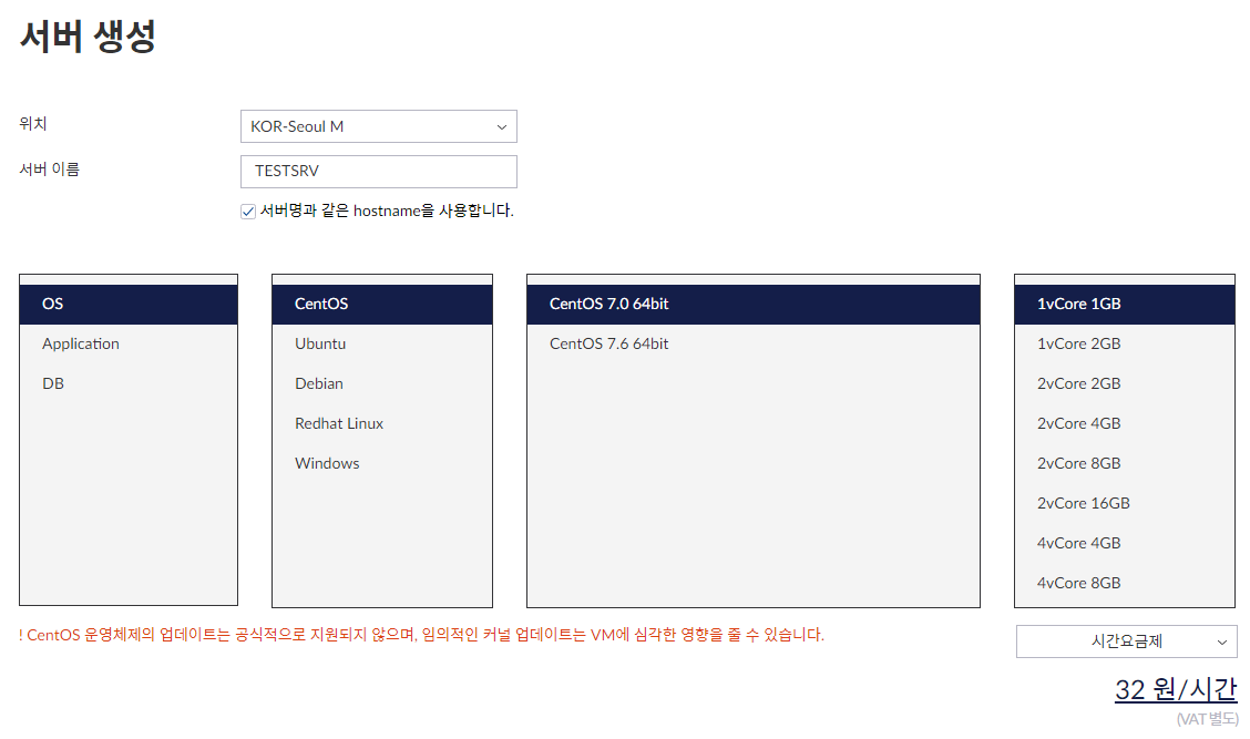이제 서버 생성을 위해 위치, 서버 이름, OS, 사양, 요금제를 선택해야 합니다.