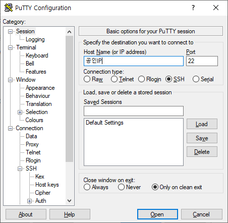 4. Session에 들어가서 SSH 접속 할 서버 IP 입력 후 Open을 눌러줍니다.