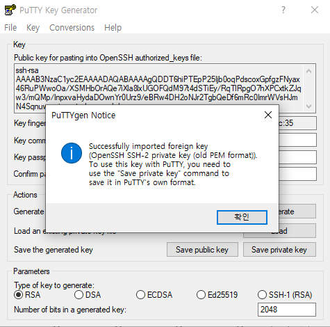1. puttygen 프로그램 실행 후 pem파일을 불러옵니다. Successfully가 뜨면 성공입니다.