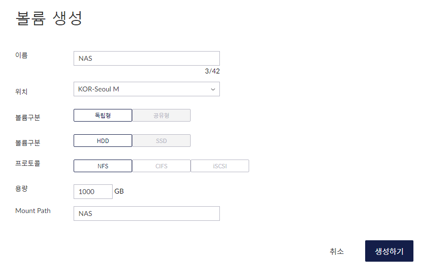 4. 이름과 Mount Path 지정 및 프로토콜 CIFS 선택 후 생성하기 클릭