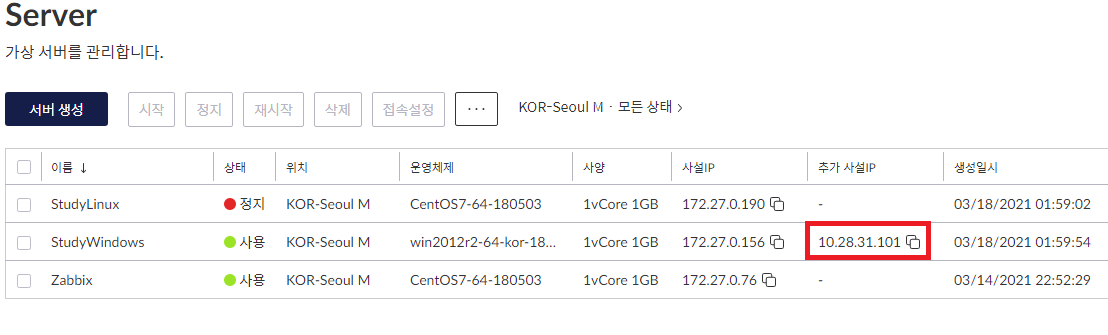 그럼 윈도우 서버쪽에 추가 사설IP란에 IP가 추가 된것을 확인 할 수 있습니다.