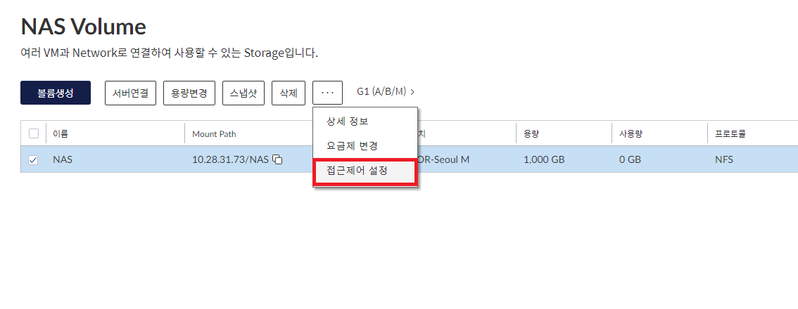 4. 만들어진 NAS 선택 후 접근제어 설정 클릭