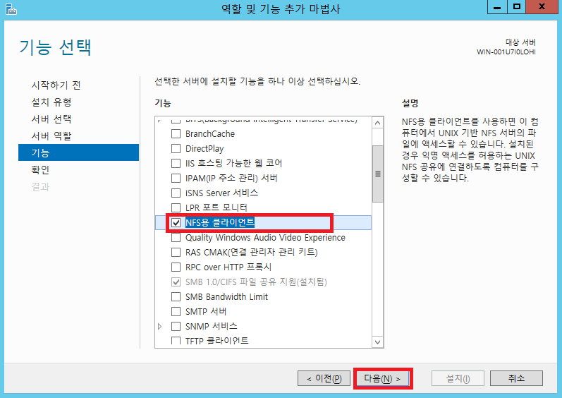 이렇게 윈도우 서버가 완성되었으면 다음으로 NFS 클라이언트라는 기능을 설치해줘야 합니다.