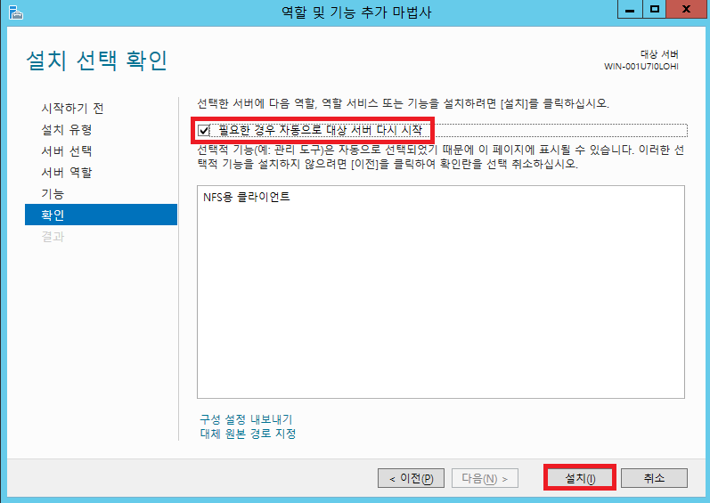 필요한 경우 자동으로 대상 서버 다시 시작 체크 후 설치를 눌러줍니다.