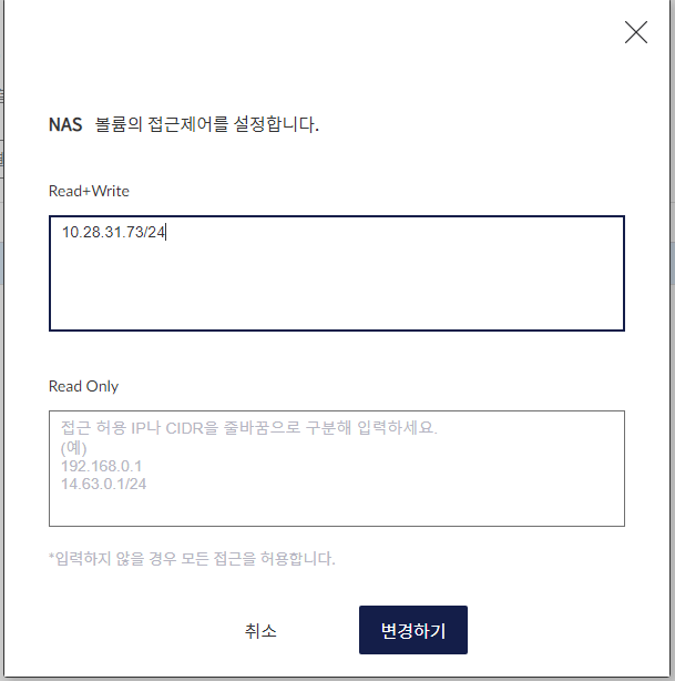 5. 읽기 + 쓰기 or 읽기 권한 중 선택 및 자신의 Mount Path IP 대역을 적어주시면 됩니다.
