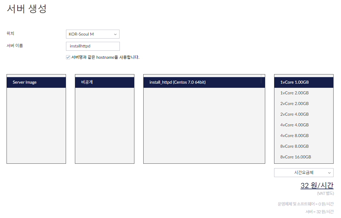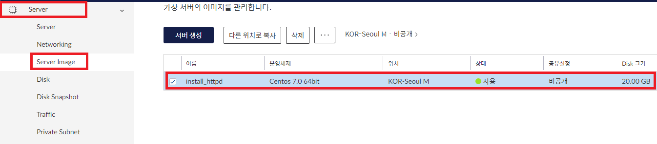 이제 방금 만든 이미지를 가지고 서버 생성을 해봅시다. 이미지 체크 후 상단 서버 생성 버튼을 눌러줍니다.