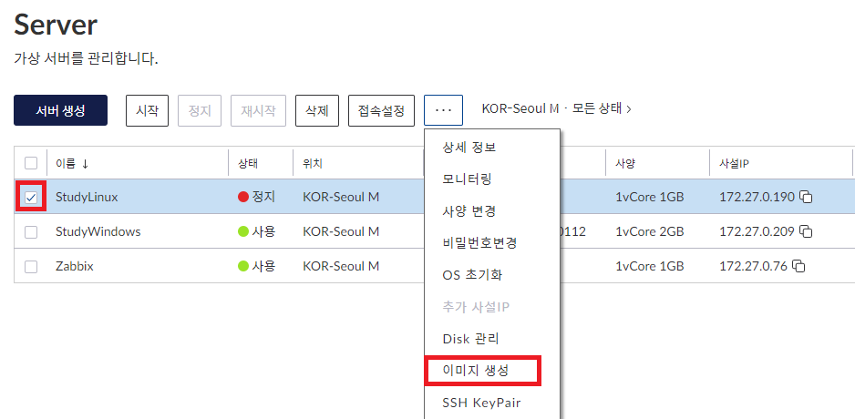 4. 서버를 종료 후 이미지 생성할 서버를 체크 후 이미지 생성을 눌러줍니다.