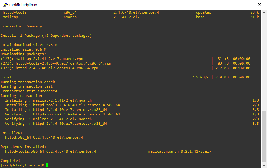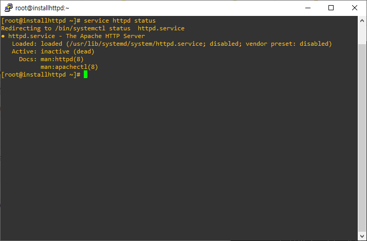 2. 패키지가 설치되었으면 service httpd status 명령어로 설치가 되었는지 확인해봅시다.