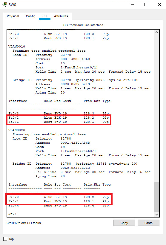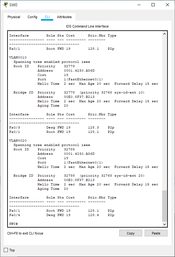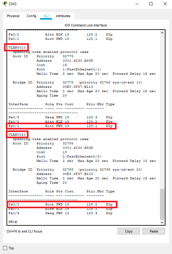 우선순위를 낮춘 VLAN 20은 fa0/2 포트가 루트로 선정된 것을 볼 수 있습니다.