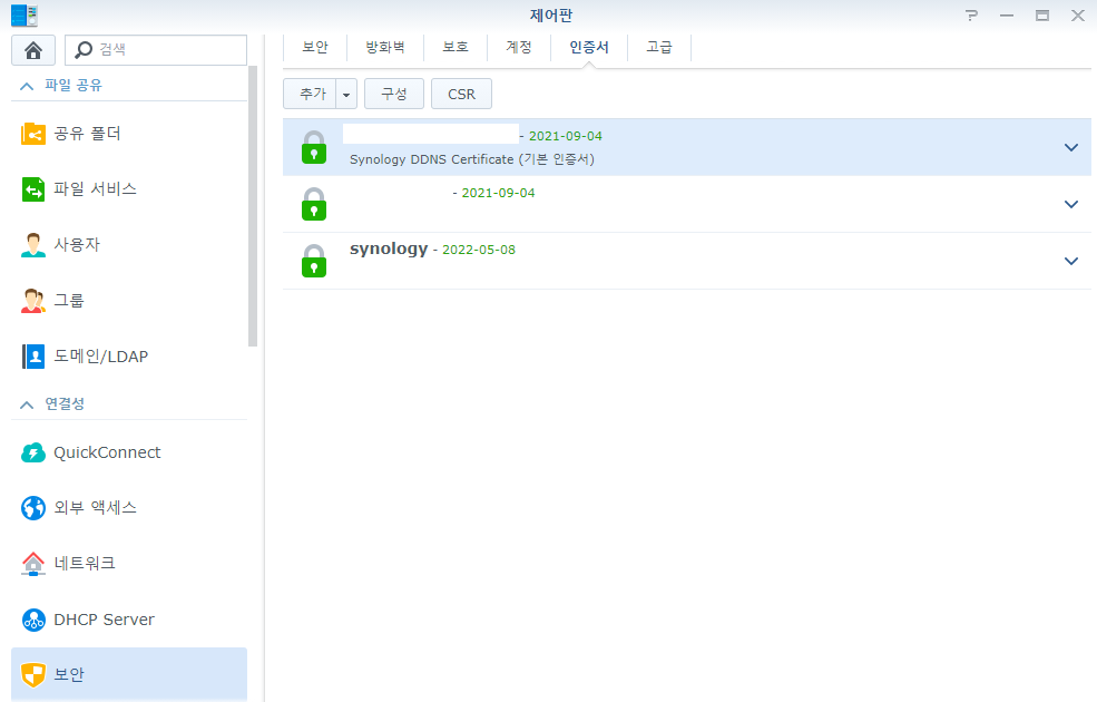 DSM에 로그인 후 제어판 -> 보안 -> 인증서에 들어가 주세요.