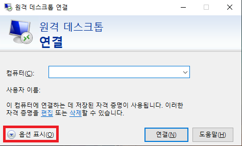 원격 데스크톱을 연결하기 전에 옵션 표시를 눌러줍니다.