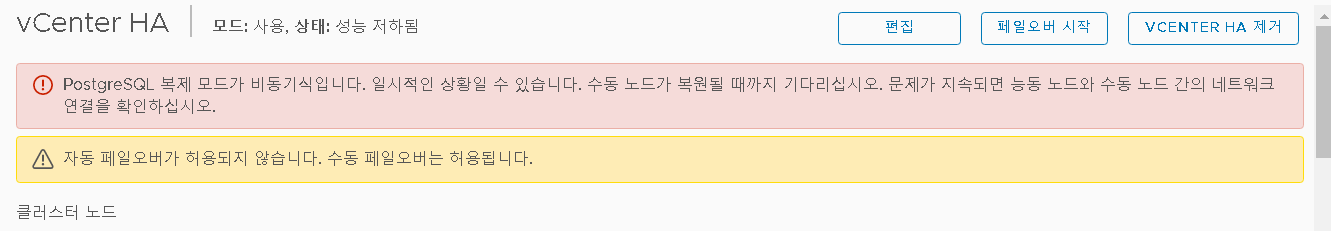 vCenter HA 구성 직후에는 Active - Passive 사이에서 데이터베이스 및 설정 정보 등의 경고가 발생하게 되는데