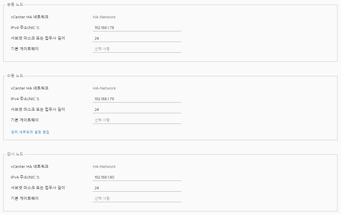 6. 네트워크 설정에서는 관리 네트워크, vCenter HA 네트워크를 지정 후 넘어가 주세요.