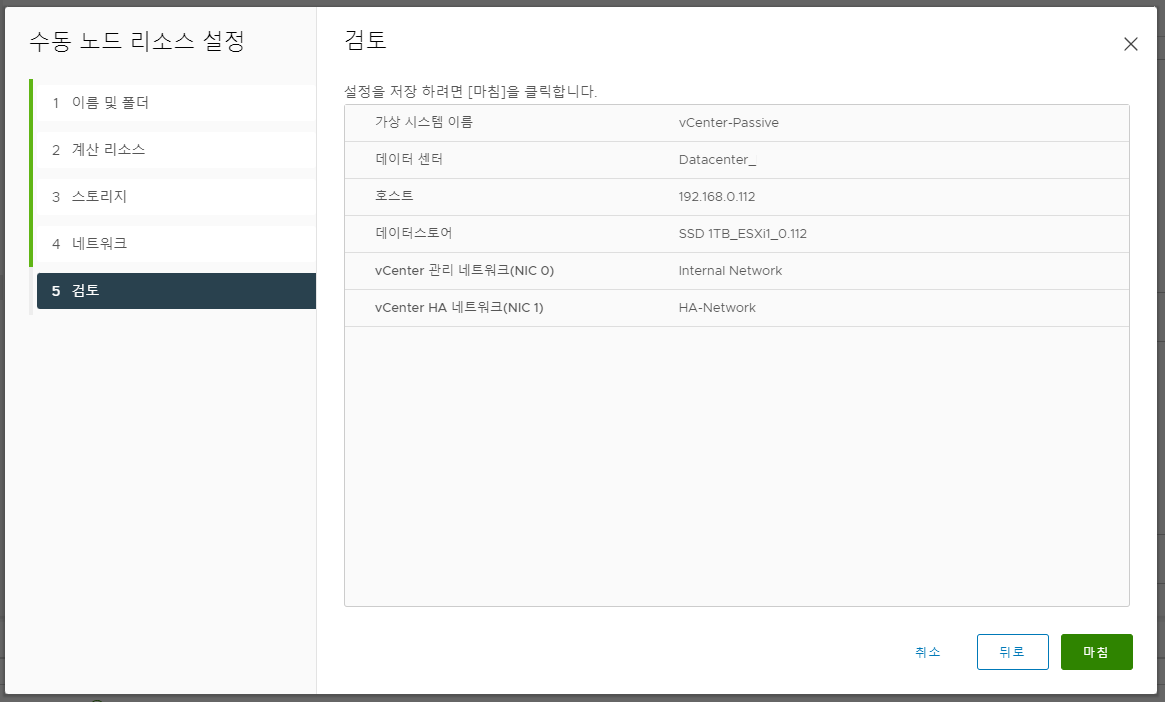 7. 마지막 Passive-vCenter(수동) 관련 설정을 검토하고 마침을 눌러 Passive 설정을 끝내줍니다.