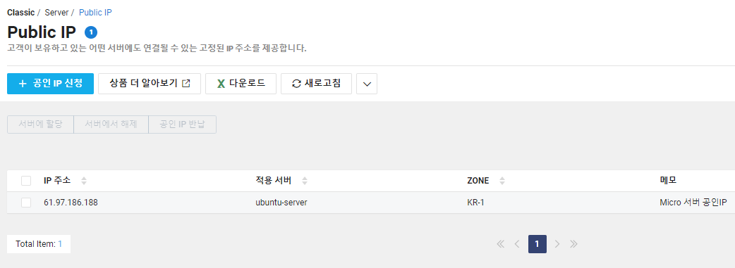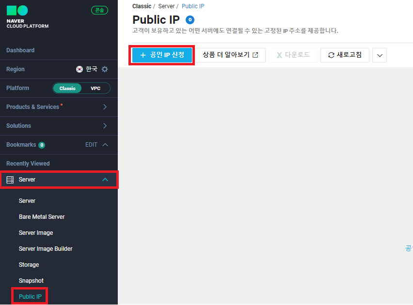 1. 콘솔 접속 후 좌측 카테고리에서 Server -> Public IP -> 공인 IP 신청을 눌러주세요.