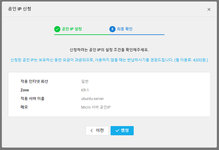 Micro서버와 같은 Zone으로 선택 후 적용 서버 선택에서 저번 시간에 생성한 서버를 선택해주고 넘어가주세요.
