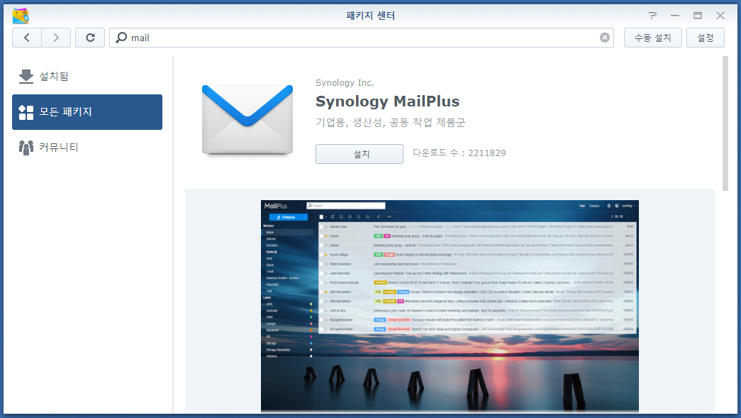 1. 패키지 센터에서 Synology MailPlus 를 찾아 설치해줍니다.