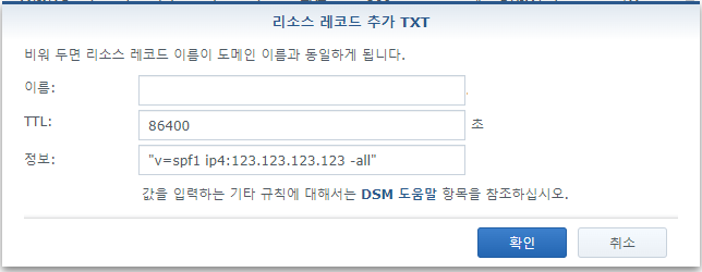 SPF 검증을 위해서는 DNS 서버에 TXT 레코드를 추가합니다. 형식은 아래와 같습니다.