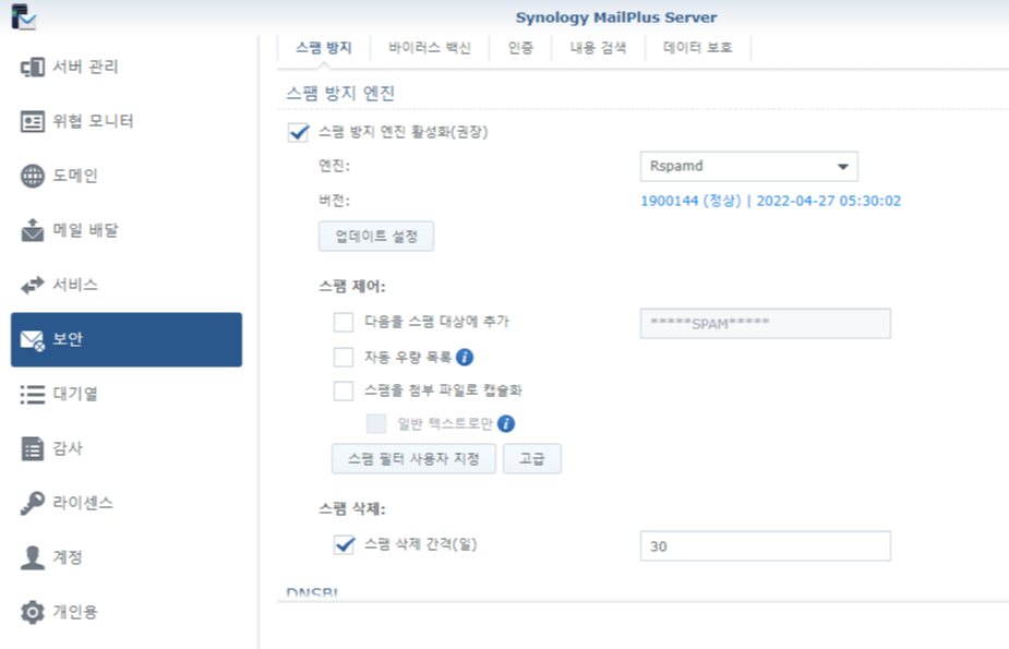 좌측 카테고리에서 보안을 선택 후 스팸 방지 탭으로 가줍니다.