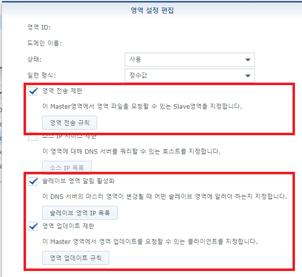 여기서는 영역 전송 제한, 슬레이브 영역 알림 활성화, 영역 업데이트 제한 3개 설정을 진행하겠습니다.
