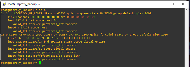 여기까지 설정을 마치고 IP를 보게 되면 Haproxy_Master에 192.168.1.200 VIP가 추가된 걸 볼 수 있습니다.