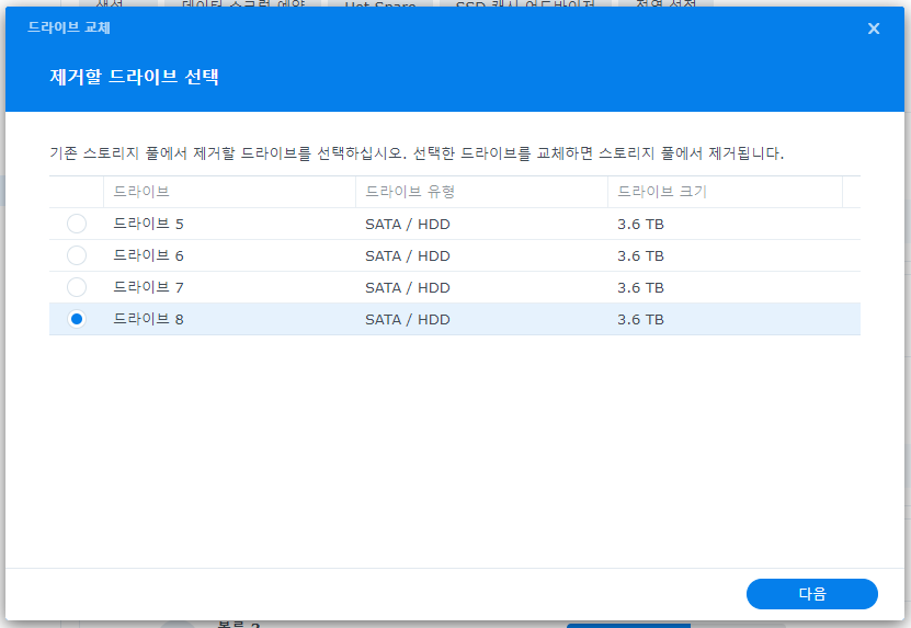 2. 기존 RAID5 스토리지 풀 디스크에서 교체할 디스크를 선택 후 다음으로 넘어갑니다.
