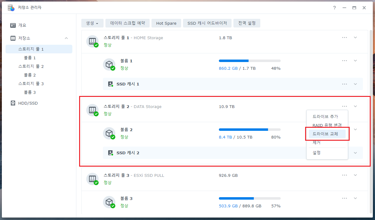 하지만 이번 DSM 7에 올라오면서 드라이브 교체라는 기능이 생겼고, 훨씬 안전하게 교체가 가능해졌습니다.